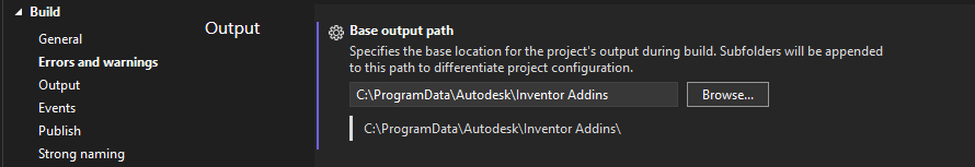 Go to Build -> Output and set the Base outputh path to C:\ProgramData\Autodesk\Inventor Addins.