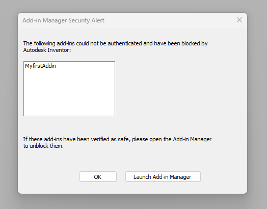 This will build your addin to the addins folder and launch Inventor. When Inventor is launched, you will see the following message: