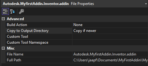 Now that that is done, go to your solution explorer again and click on Autodesk.MyFirstAddin.Inventor.addin and set Copy to Output Directory to "Copy if newer"